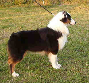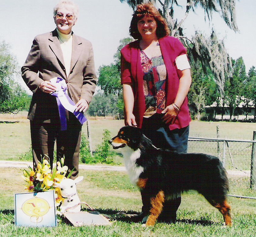 Clips did well at the 2000 National Preshow, the only one she was entered in! She made the cut out of the large class in the Open Red merle with stiff competition. She is such a piece of work and a joy to show. Her eyes are cleared and she is also OFA EXCELLENT! Her full brother, Soundtrack's Tuned In, FDCH, (Radio) is shown on our extended family page, showing the intensity and love for action they both possess.