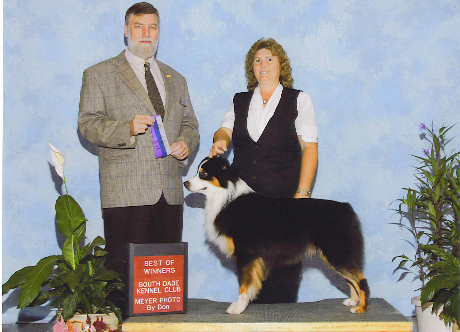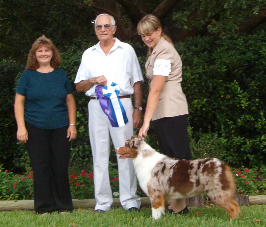 Clips did well at the 2000 National Preshow, the only one she was entered in! She made the cut out of the large class in the Open Red merle with stiff competition. She is such a piece of work and a joy to show. Her eyes are cleared and she is also OFA EXCELLENT! Her full brother, Soundtrack's Tuned In, FDCH, (Radio) is shown on our extended family page, showing the intensity and love for action they both possess.