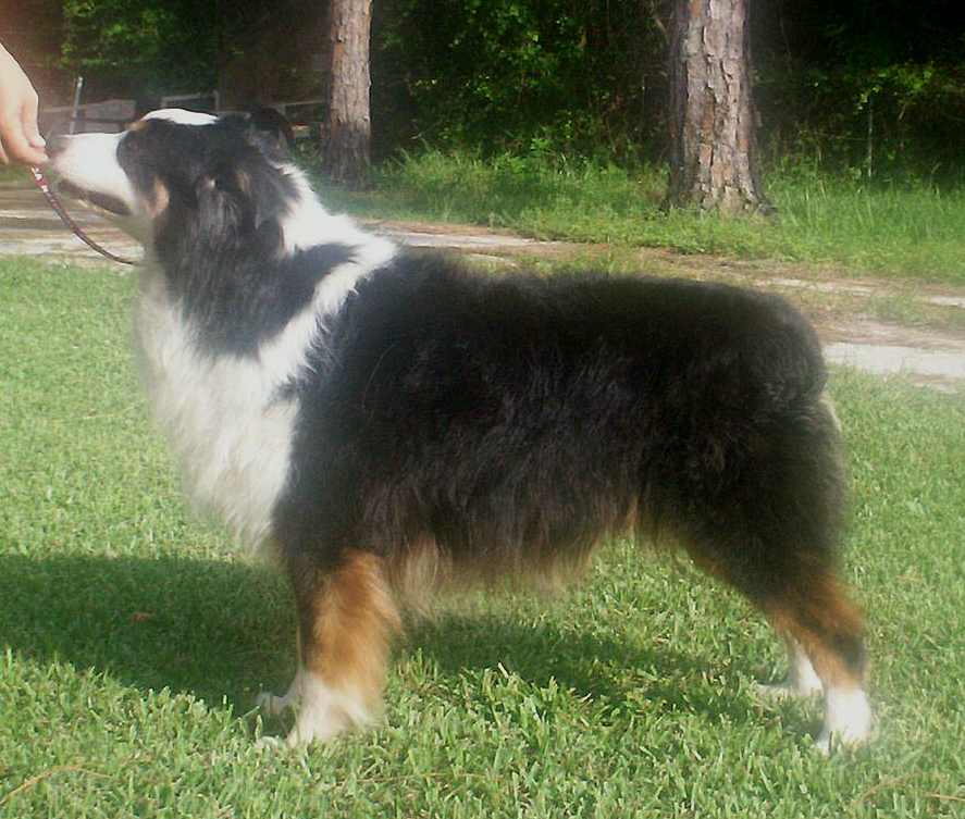 Double CH. Johnny is a beautiful, happy, red factored black tri weighing 54 lbs and standing 21 1/2". He has full dentition and scissors bite still at age 12!. With gorgeous side gait, attitude and a beautiful profile, Johnny stands out in a crowd. Johnny is a BOB winner and finished his AKC CH with 3 majors and 17 points. He also finished his ASCA CHAMPIONSHIP with 3 - 5 point majors. He is OFA-Good, DNA'd and eyes are clear. Johnny has stamped his pleasing attitude and wonderful structure in all of our Soundtrack dogs.